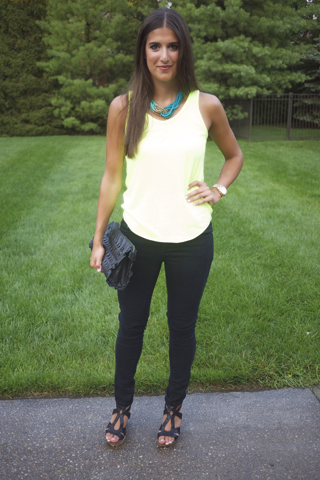 I love the turquoise necklace with the neon, it is so bright and fun! And you are seriously tan. I live at the beach and I'm still not as tan as you, haha. Have a great weekend, Grace!