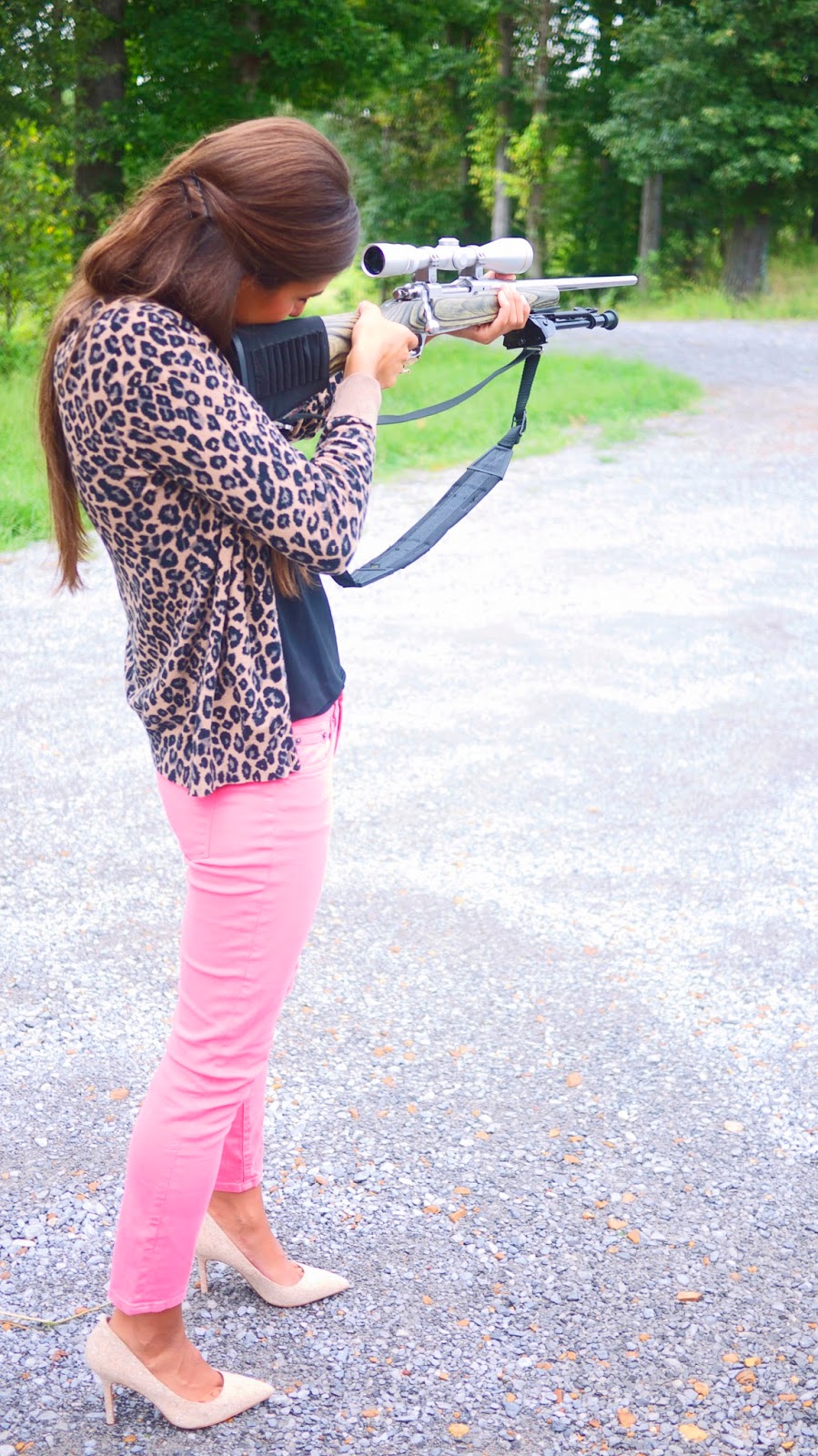 I was originally going to comment on how pretty and feminine you look in your outfit but then I saw the last the last two photos and I thought, "wow, how badass!"I love the juxtaposition of you shooting a rifle in heels and leopard print. And pink pants haha! Great post! :]