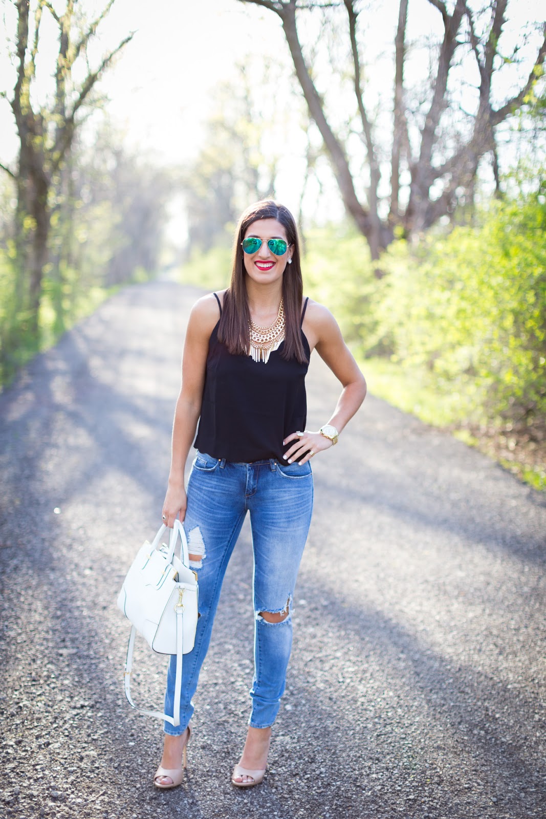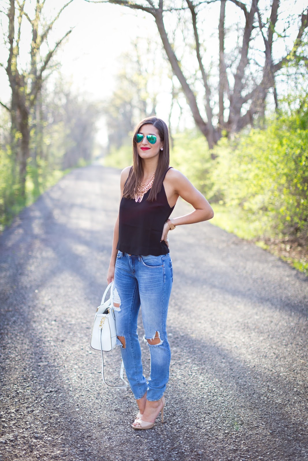 Great look! I love that tank and it's perfect for summer and can be layered with a nice cardigan later. I finding things like that on sale and especially with free shipping from Nordstrom, it's a steal… Also, love those jeans and bag!